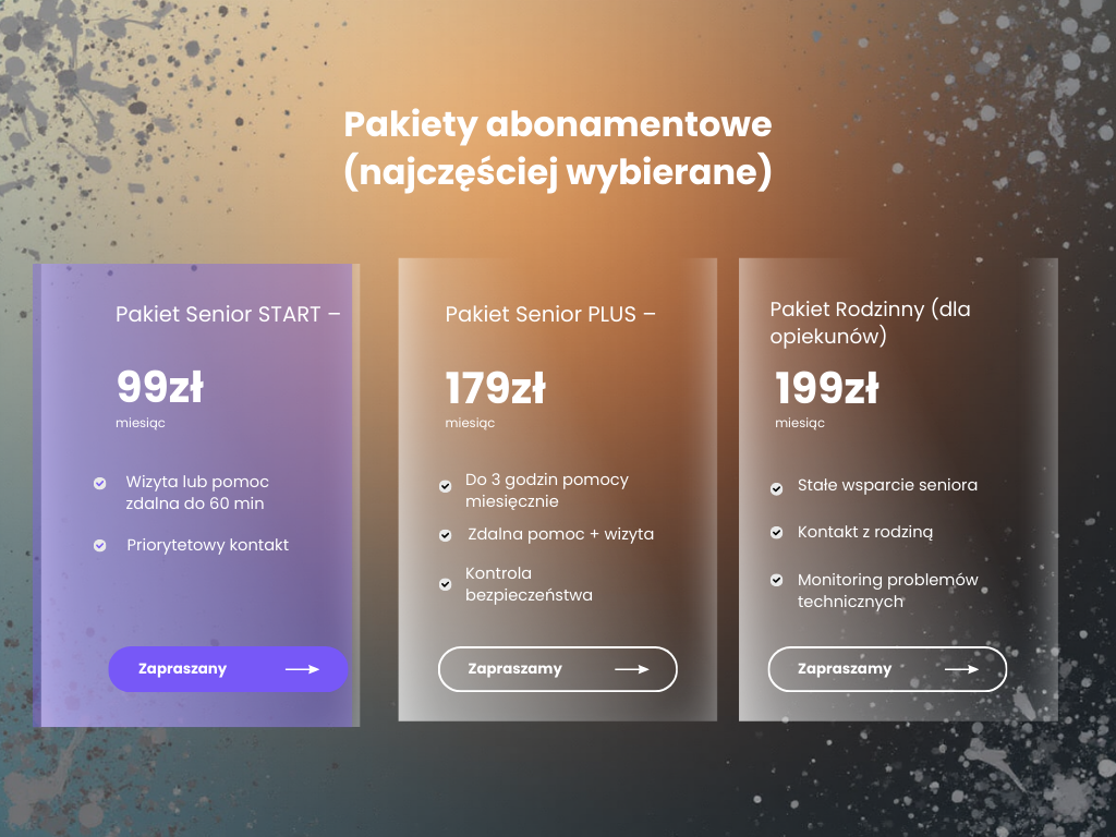 - Wizyta serwisanta w domu seniora (do 30 min) – 80 zł